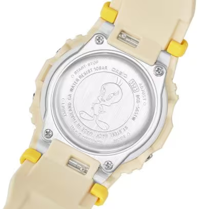 Die BGD-565 und ihre klassische eckige Form präsentieren sich in einem wunderschönen mattbeigen Retro-Look. Die Bandschlaufe und Ringe in kanariengelb sind eine Anspielung auf den Cartoon-Vogel, ebenso wie der „TWEETY“-Aufdruck auf dem Band. Auf dem Zifferblatt ist eine Zusammenstellung der vielen liebenswerten Ausdrücke von Tweety im originalen Baby-G Design zu sehen. Drücken Sie den Knopf, um die LED-Hintergrundbeleuchtung zu aktivieren und seine Silhouette auf dem LCD anzuzeigen. Auf der Rückseite des Gehäuses ist Tweety in seiner klassischen Pose eingraviert.