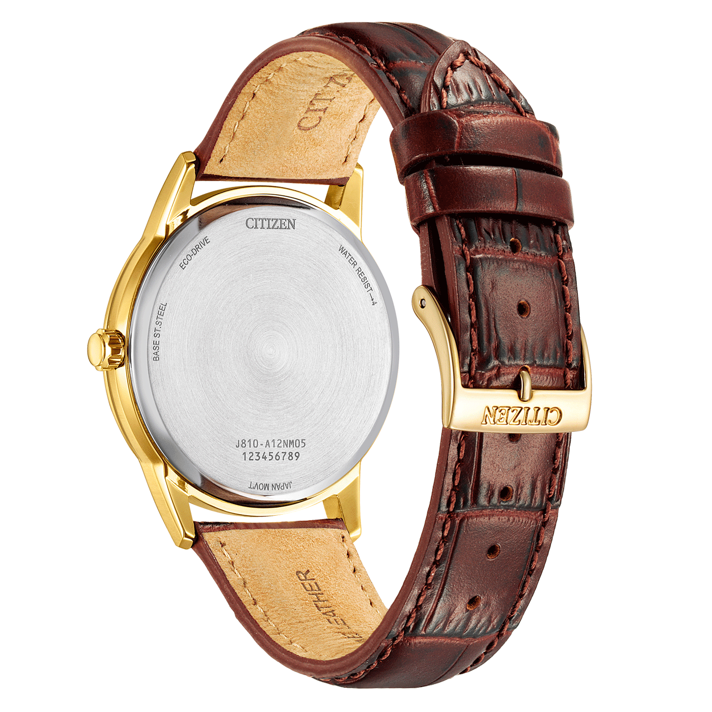 Das goldplattierte Edelstahlgehäuse hat einen Durchmesser von 40 mm und eine Höhe von nur 9 mm, was für ein angenehmes Tragegefühl sorgt. Das Kristallglas schützt das Ziffernblatt vor Kratzern, während die Wasserdichtigkeit bis zu 3 Bar zusätzliche Sicherheit im Alltag bietet. Das braune Lederband ergänzt das Design harmonisch und sorgt für hohen Tragekomfort. Mit einem Gewicht von lediglich 48 g ist die Citizen AW1782-11A nicht nur leicht, sondern auch perfekt für jeden Anlass geeignet.