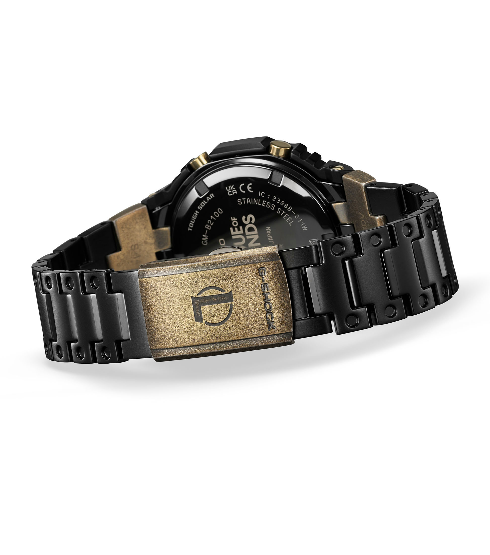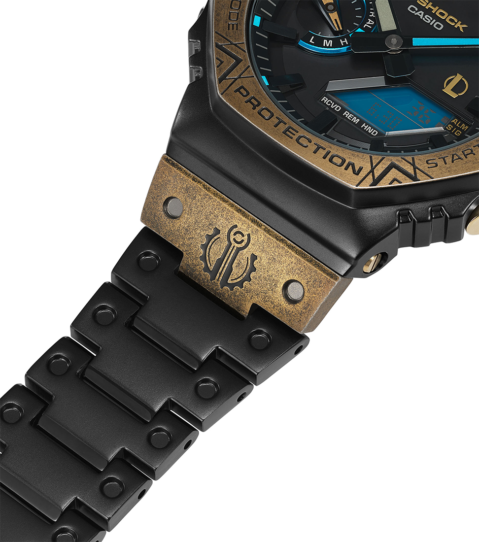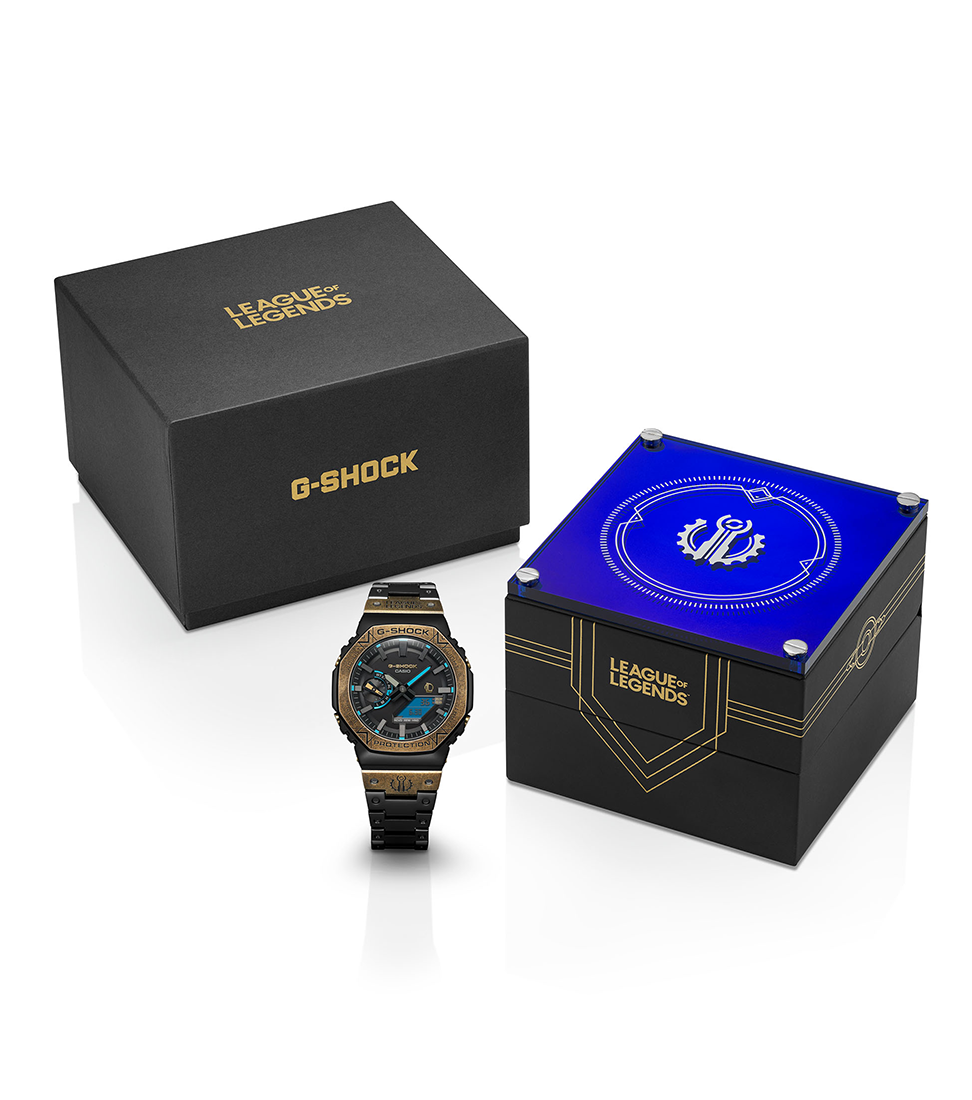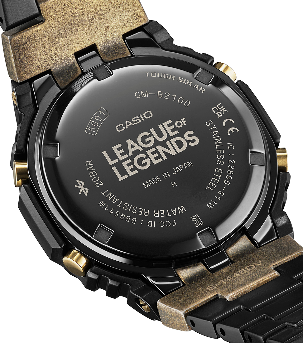 Vorhang auf für das grandiose Kooperationsmodell von G-SHOCK und dem weltweit erfolgreichen Online-Spiel League of Legends (LoL). Die analoge Vollmetalluhr GM-B2100LL-1A ist mit der magischen Hextech™-Technologie aus der Runeterra-Welt von League of Legends ausgestattet. Die Lünette und ein Teil des Bandes sind mit einer Ionenplattierung beschichtet, die zunächst Gold und dann Schwarz gefärbt und teilweise wieder abgerieben wurde, um der Uhr den Used-Look zu verleihen. Blaue Akzente auf dem LCD und weiteren Stellen unterstreichen die Fusion der Magie, Wissenschaft und Technologie von Hextech™ mit G-SHOCK.