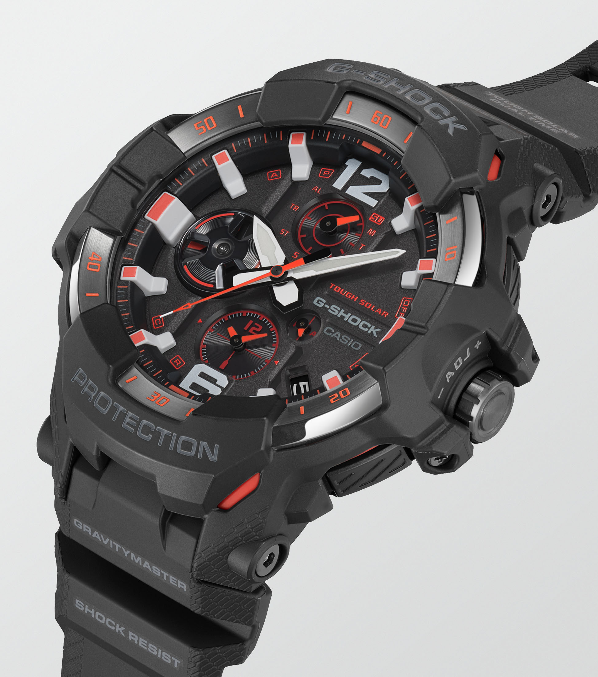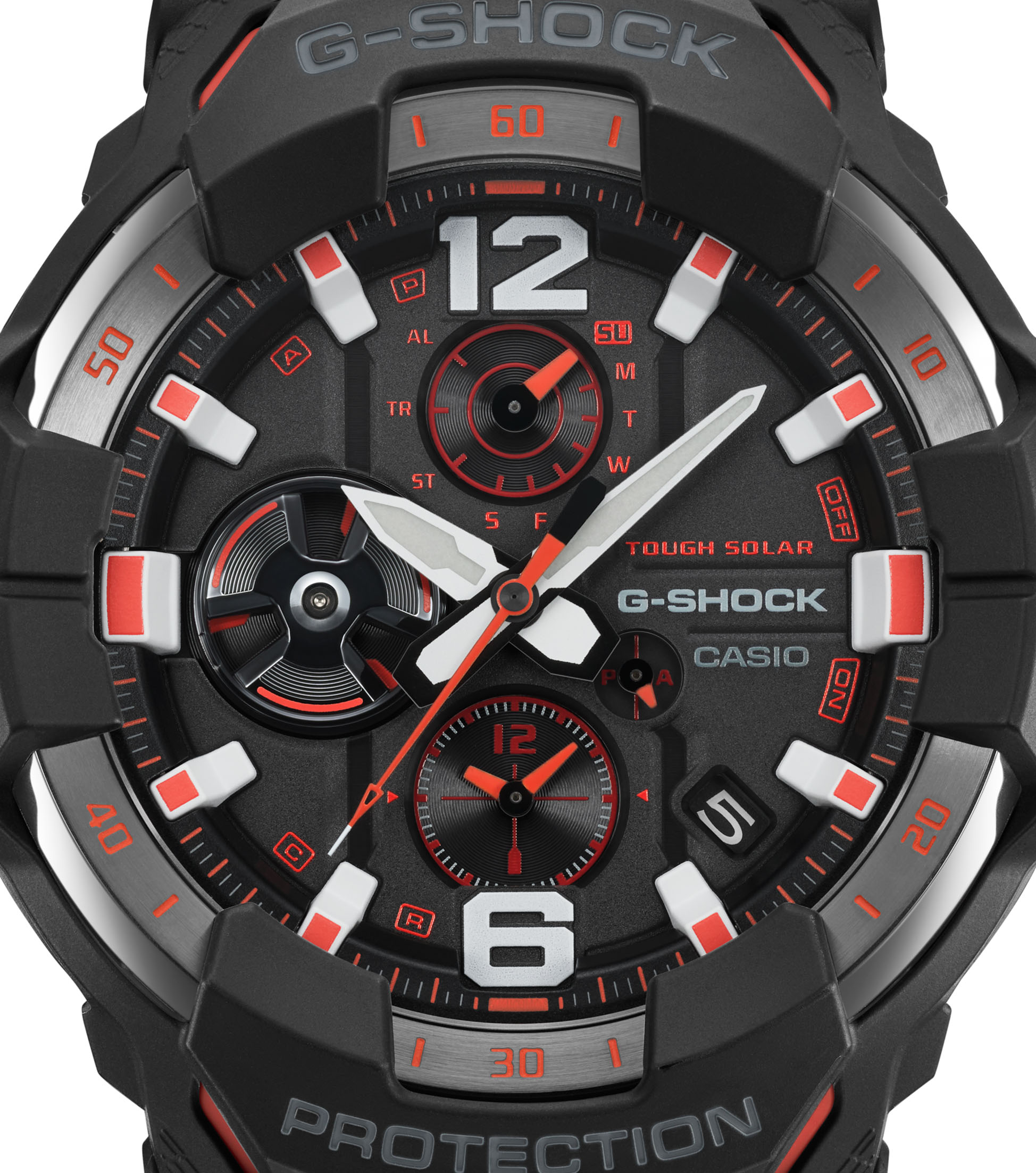 Die GR-B300 verfügt über eine Carbon Core Guard-Konstruktion, die Stoßfestigkeit, Steifigkeit und Korrosionsbeständigkeit bietet. Diese Technologie stammt aus dem Flugzeugbau und macht die Uhr extrem widerstandsfähig. Das Gehäuse besteht aus karbonfaserverstärktem Kunstharz, und die nahtlose Lünette ist von modernen Flugzeugen inspiriert, was der Uhr ein markantes und kraftvolles Aussehen verleiht.