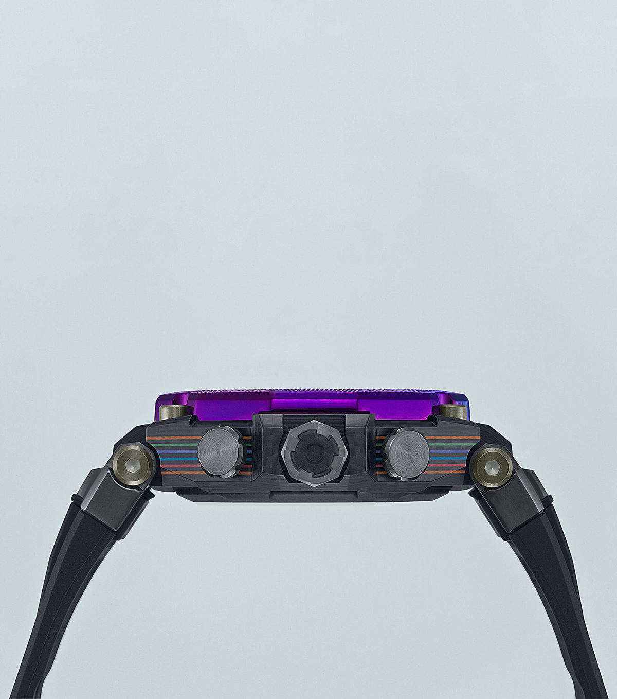 Entdecken Sie die innovative Form und die strukturelle Schönheit des MT-G Zeitmessers, der geschickt Metallmaterialien mit dem Resin kombiniert, das in den frühen G-SHOCK Modellen verwendet wurde. Inspiriert von den hellen Lichtern der Großstadt, verfügt die MTG-B2000YR über einen mehrlagigen Karbonrahmen, der durch das Laminieren von Karbon mit mehrfarbigen Glasfasern hergestellt wird. Die Lünette aus regenbogenfarbenem ionenplattiertem Edelstahl ist mit Mustern versehen, die an eine Stadtsilhouette erinnern. Die farbenfrohe Datumsanzeige und die regenbogenfarbenen Indexe, Zifferblattzeiger sowie das MT-G-Logo geben der Uhr ein raffiniertes Farbspektrum. Dieser Zeitmesser ist nicht nur schön, sondern auch sehr funktional.