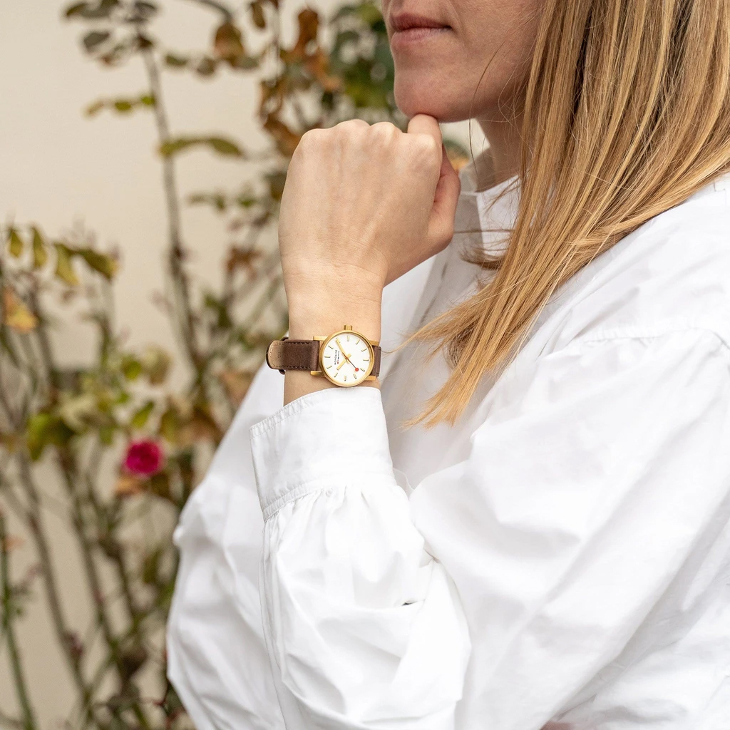 Zeitloses Design: mit elegantem Finish Mit ihrem harmonisch gestalteten, gebürsteten Edelstahlgehäuse im Goldton ist diese Mondaine Evo2 ein echter Hingucker und sehr angenehm zu tragen. Die Ton-in-Ton goldfarbigen Zeiger sind ein elegantes Designelement. Saphirglas schützt das ikonische silberne 30 mm Ziffernblatt. Das braune Lederarmband rundet das minimalistische Design dieser Uhr ab.