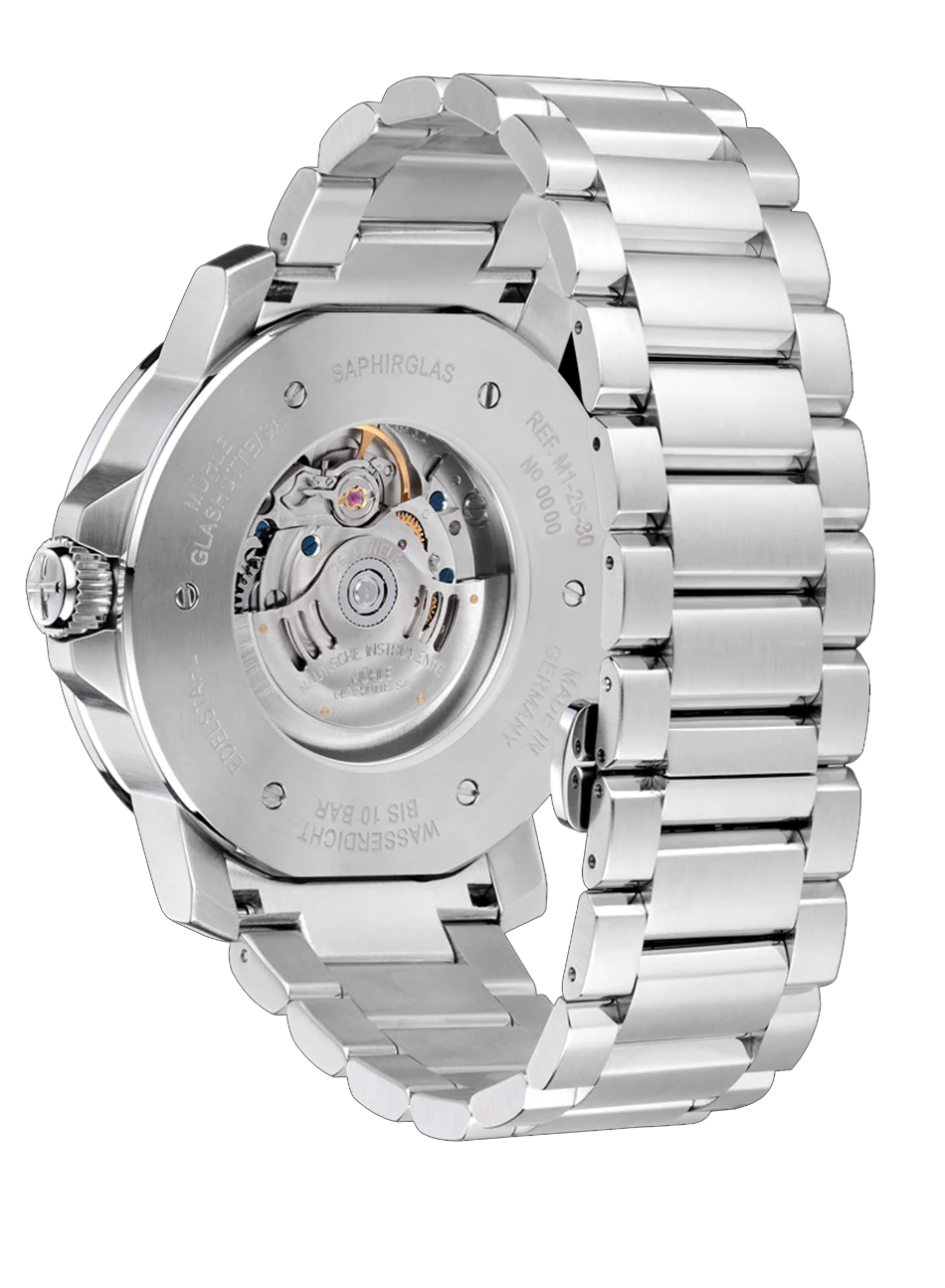 Die Mühle-Glashütte 29er Big mit der Referenz M1-25-33-MB ist die perfekte Kombination aus Eleganz und Robustheit. Diese Armbanduhr besticht durch ihr sportliches Design und ihre hochwertige Verarbeitung. Das Edelstahlgehäuse mit entspiegeltem Saphirglas und verschraubter Krone bietet optimalen Schutz und Langlebigkeit. Der Flankenschutz schützt die Krone vor seitlichen Stößen, was die Uhr besonders robust macht.