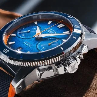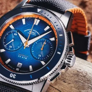 Abmessungen und Design Der Chronograph hat einen Durchmesser von 42,5 mm und eine Höhe von 15,5 mm, mit einer Gesamthöhe von 50,3 mm. Das Gehäuse besteht aus geschliffenem und poliertem Edelstahl, was ihm ein elegantes und sportliches Aussehen verleiht. Die beidseitig drehbare Lünette mit blauem Keramik-Inlay und das doppelt entspiegelte Saphirglas unterstreichen die hochwertige Verarbeitung. Der Boden der Uhr ist mit einem Sichtfenster ausgestattet, und die Krone ist verschraubt, um maximale Sicherheit zu gewährleisten.