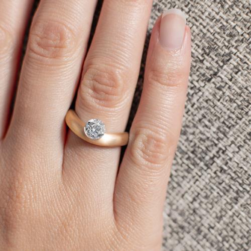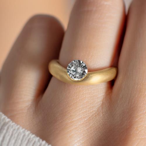 Design und Handwerkskunst Die matt gebürstete Ringschiene aus 750 Gelbgold schmiegt sich sanft wie ein Halbmond um den Finger der Trägerin. Mittig, fast schwerelos, schwebt ein funkelnder Solitaire mit einem Gewicht von 0,45 Karat und einer Reinheit von IF/G. Der Diamant kann in diesem meisterhaft gestalteten Schmuckstück seine volle Strahlkraft und erhabene Schönheit nahezu uneingeschränkt entfalten.