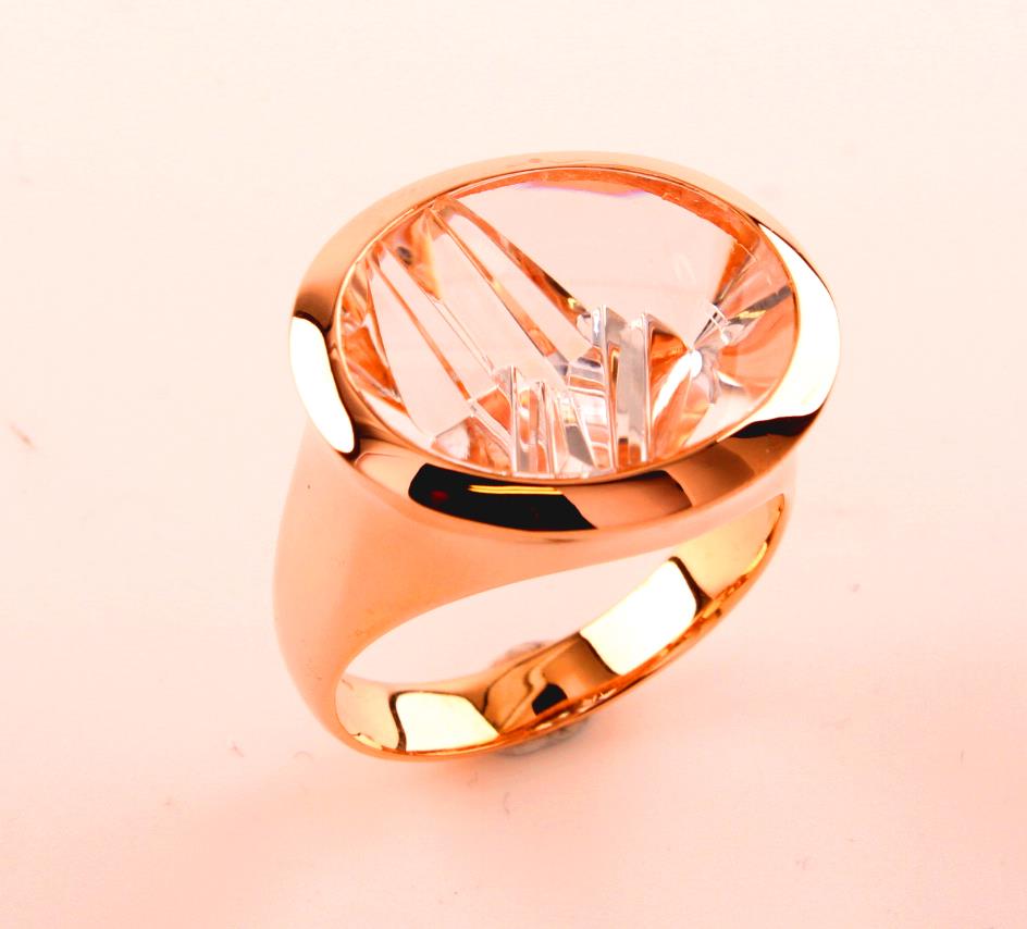 Der Ring ist aus 750er Rotgold gefertigt und hat einen Bergkristall, der seines Gleichen sucht.